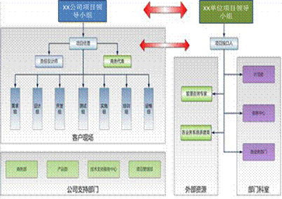 本项目的项目组织架构由XX报社项目组和XX公司项目组共同组成,采用项目领导组领导下的各级项目组长负责制,并明确规范所属各组的职责及组间协调关系。这种组织结构是XX公司在多个大型工程项目采用,并被验证为行之有效的工程组织方案。